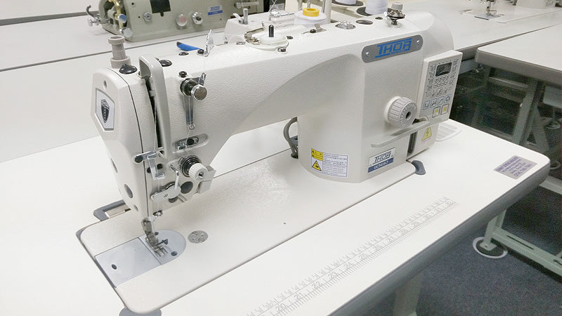 For sewing general fabrics of medium weight materials such as cottons, wovens and denim. This is a high speed, single needle straight-stitch, lock-stitch NEEDLE FEED sewing machine. This THOR machine features automatic functions and is ideal for high speed sewing of jeans, workwear, pants, canvas, etc. Equaly good for high volume sewing environments as well as alteration shops and home-based designers.